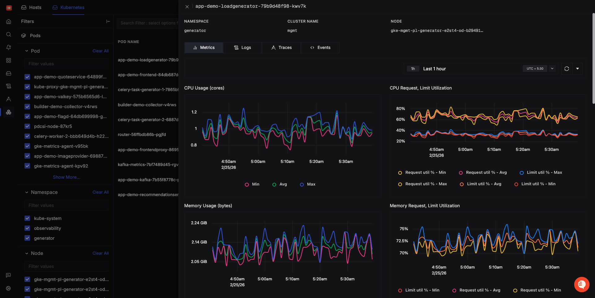 For Kubernetes, you can filter by pod, namespace, and node to monitor CPU and memory usage at the pod level, with tabs to jump to related logs, traces, and events.