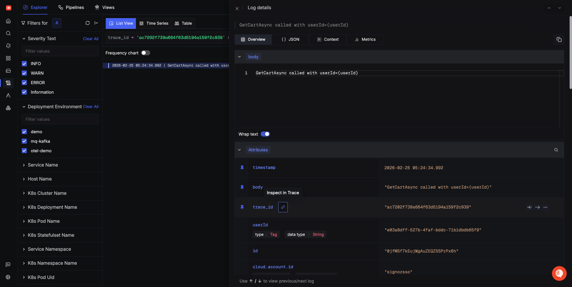 Similarly you can click on detailed view of logs and then go to related trace ID to see the flow of user requests.