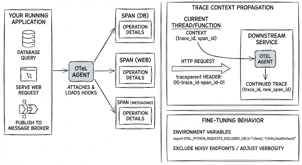 An OpenTelemetry agent attaches to your running application and loads hooks that listen for specific operations. When your code makes database queries, serves a web request, or publishes to a message broker, the hooks automatically create a span to record that activity.