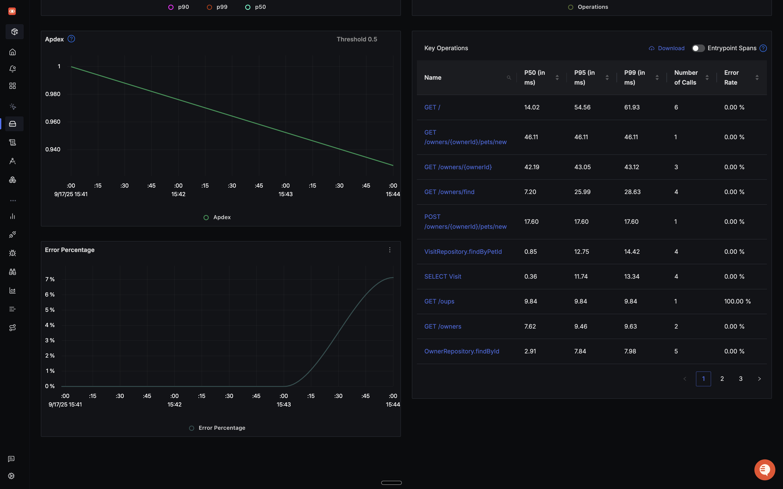 When you click on the 'Spring-Pet-Clinic' application in the 'Services' tab, you will find an overview of your application in the 'Overview' tab containing information on the Latency, Rate, Apdex, Key Operations, and Error Rate. You can also see the tabs for DB Call Metrics and External Metrics. You can select each of the charts to get more insights.