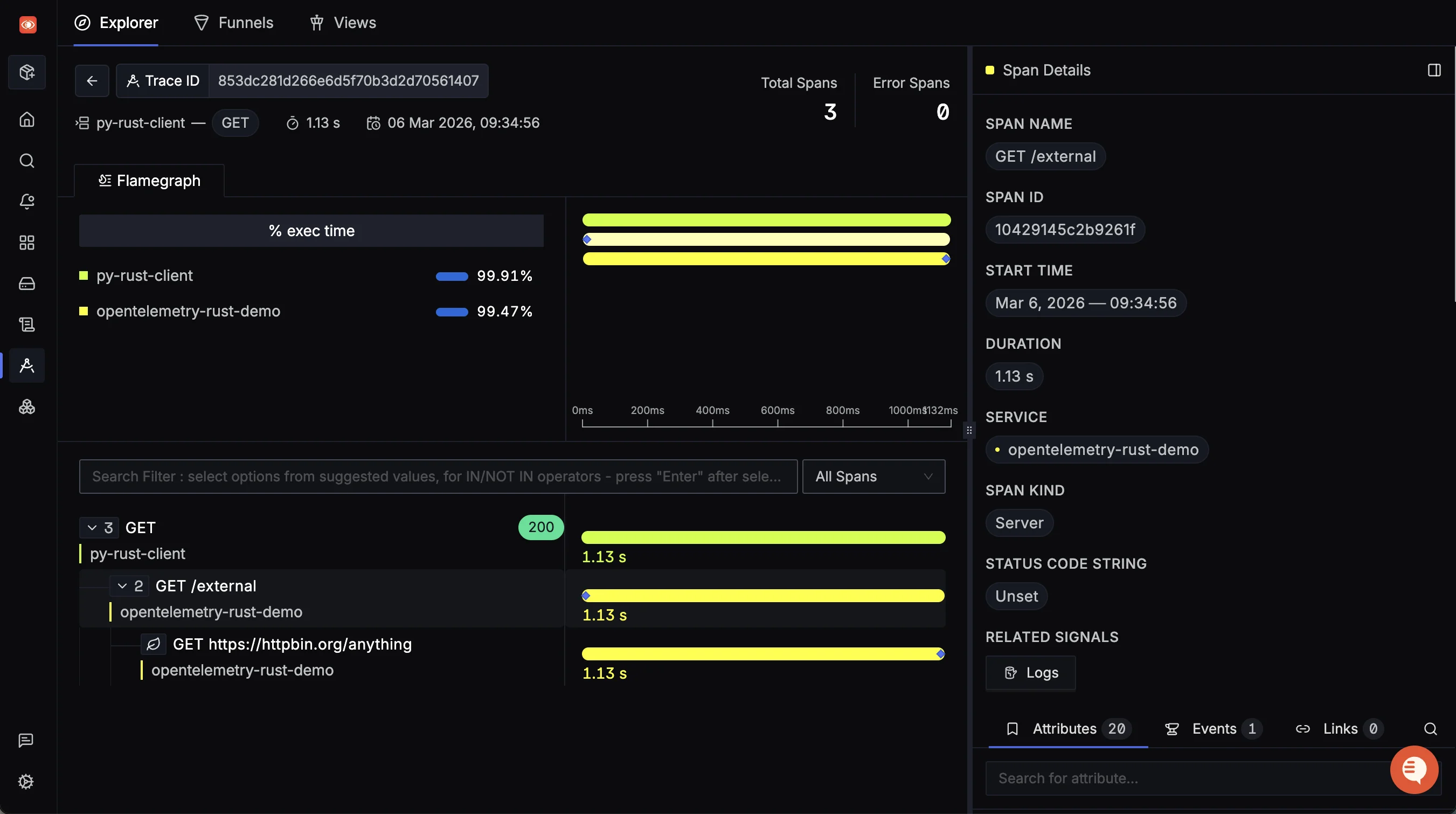 The Python script called the Rust /external endpoint, which in turn called the external httpbin.org API, propagating the trace context with each network hop.
