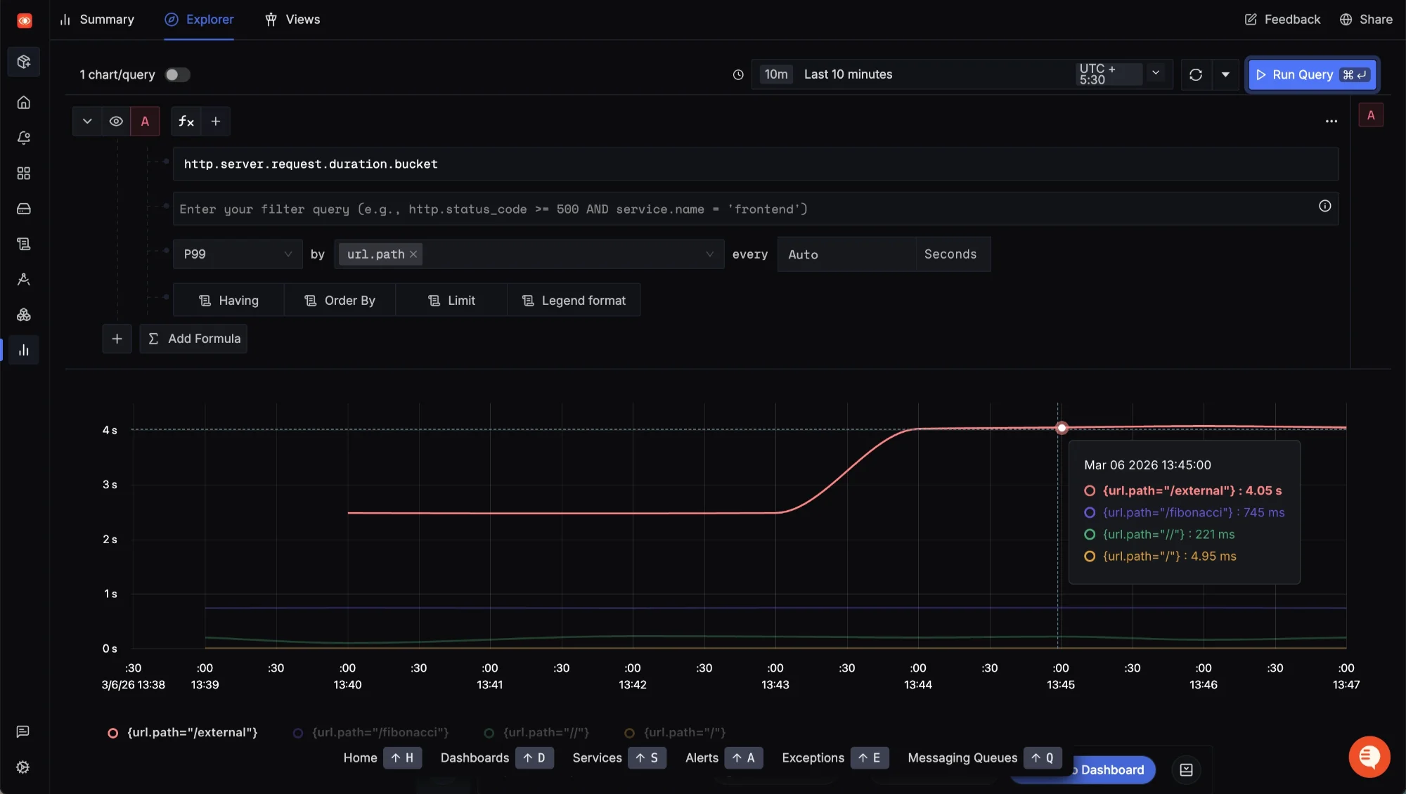 Viewing the Active Requests data per-url, we can see predictable traffic patterns. Request Duration: This metric is an OpenTelemetry histogram that records the duration of each request and increments a counter corresponding to a specific duration bucket for that endpoint. These buckets enable the observability backend to calculate percentiles and infer the performance of that endpoint over time.