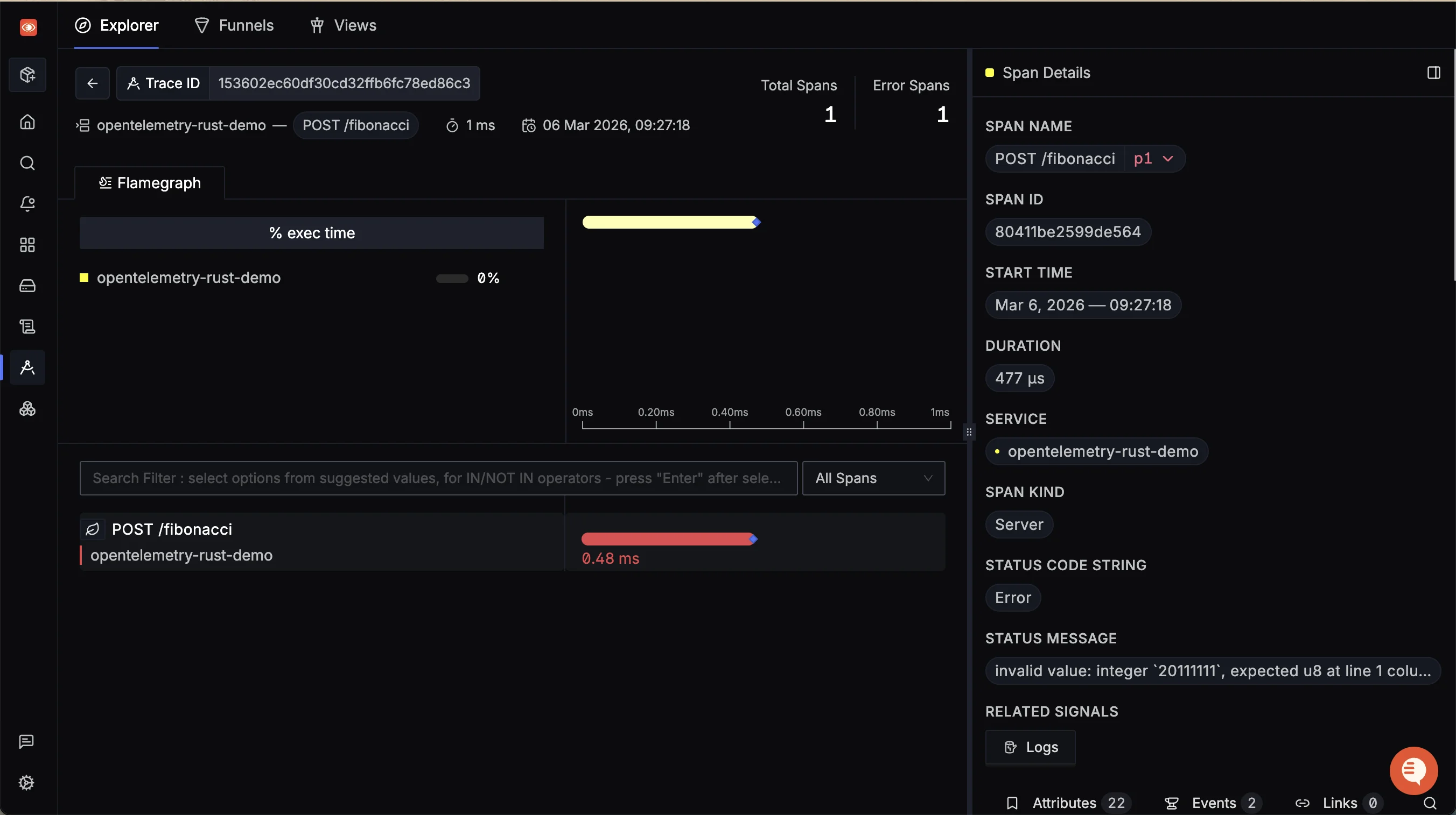 Such entries will be explicitly marked as failures by our application, and reflected in our observability backend. In SigNoz, you should now see a service named opentelemetry-rust-demo