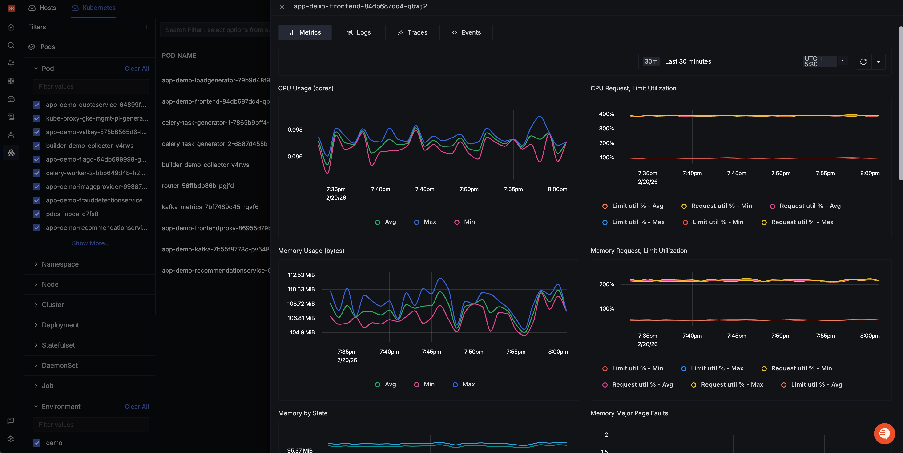 Similar to the Host Metrics Dashboard, the Kubernetes Metrics Dashboard focuses on monitoring and analyzing performance metrics. However, it is specifically tailored to Kubernetes environments, which are commonly used for container orchestration. This offers detailed visibility at the pod level, encompassing metrics concerning resource usage, health, and overall performance.