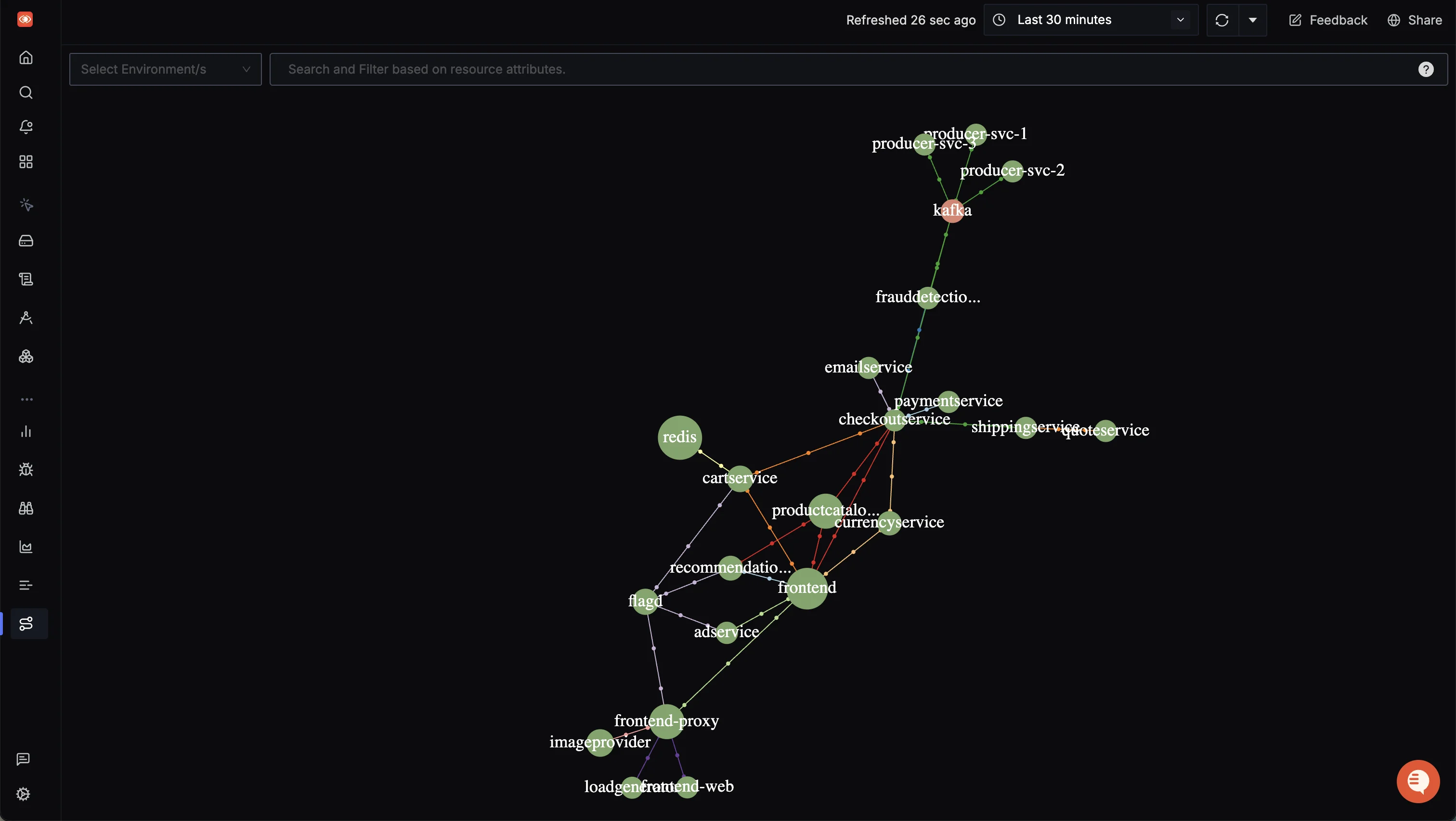 service.nameto draw the nodes in your architecture diagram. An auto-generated graph shows howcheckout-servicetalks topayment-service, and where the slowdowns are. - Infrastructure Filtering: You can filter telemetry by