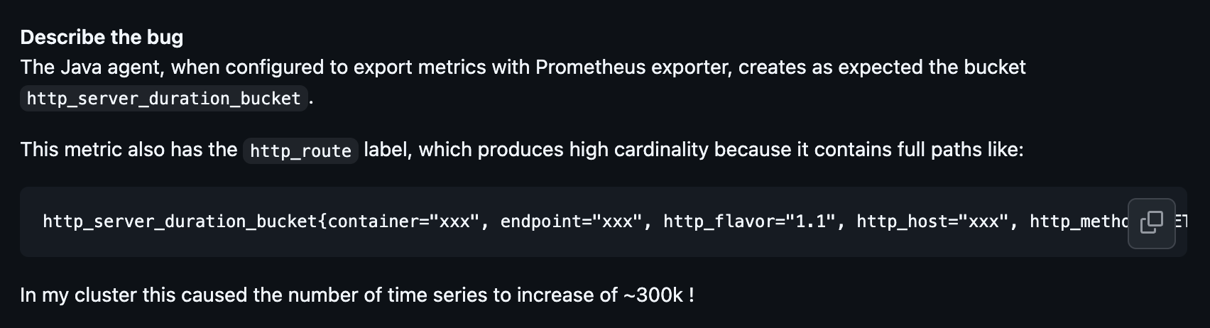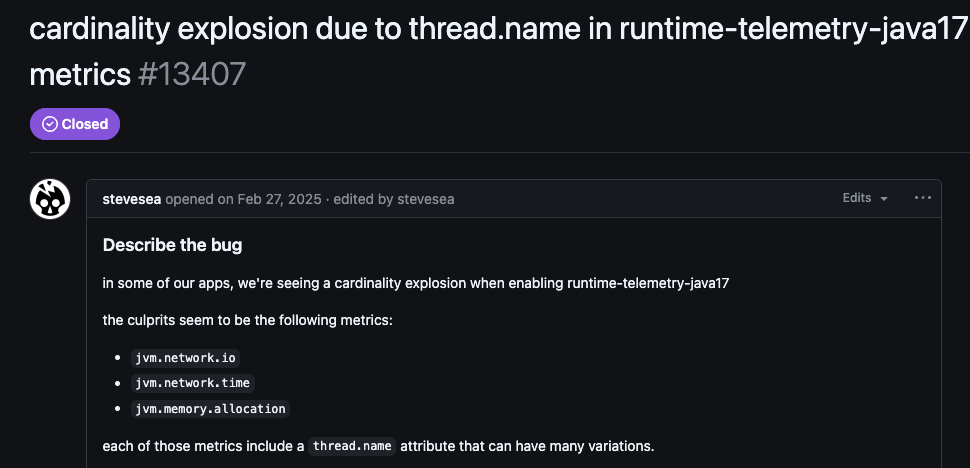 A major source of high-cardinality data occurs in Java runtime metrics like jvm.network.io or jvm.memory.allocation. Versions 2.10.0, 2.11.0, and 2.13.1 of the agent included the thread.name attribute by default in these metrics. In environments that use large thread pools or virtual threads, this creates an unbounded number of unique time series, potentially leading to a cardinality explosion.
