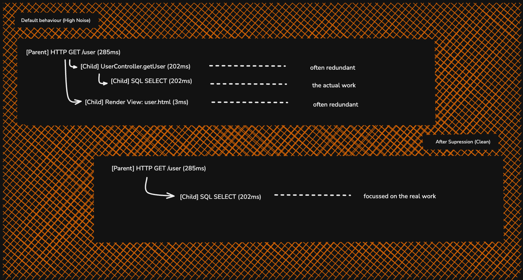 To prevent this, the OpenTelemetry Java Agent suggests using a Span Suppression Strategy. This logic detects when an instrumentation point is already wrapped by another instrumentation point higher up the call stack.