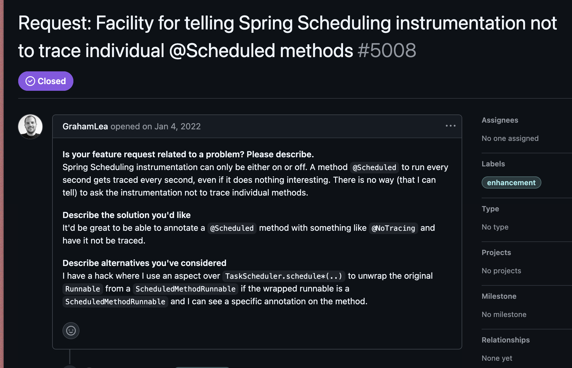 | Spring Scheduling | otel.instrumentation.spring-scheduling.enabled=false |
