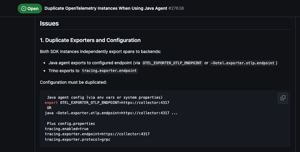 Another massive source of enterprise waste occurs when a framework like Trino initialises its own internal OpenTelemetry SDK instance instead of joining the global instance provided by the Java agent.
