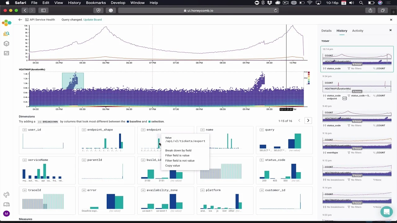 - BubbleUp: Automatically detects key attribute differences between good and bad requests, accelerating outlier identification and troubleshooting.