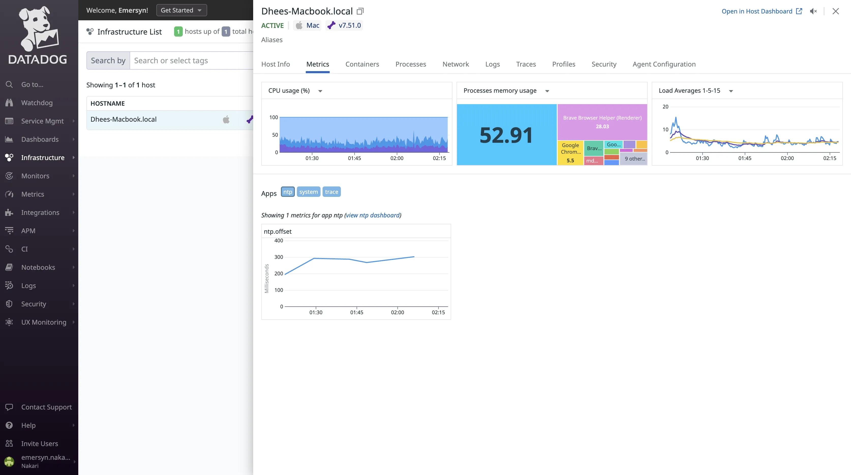With Datadog, I was able to see some of my application metrics using the Processes feature. This feature displays all the processes running on your infrastructure in real-time.