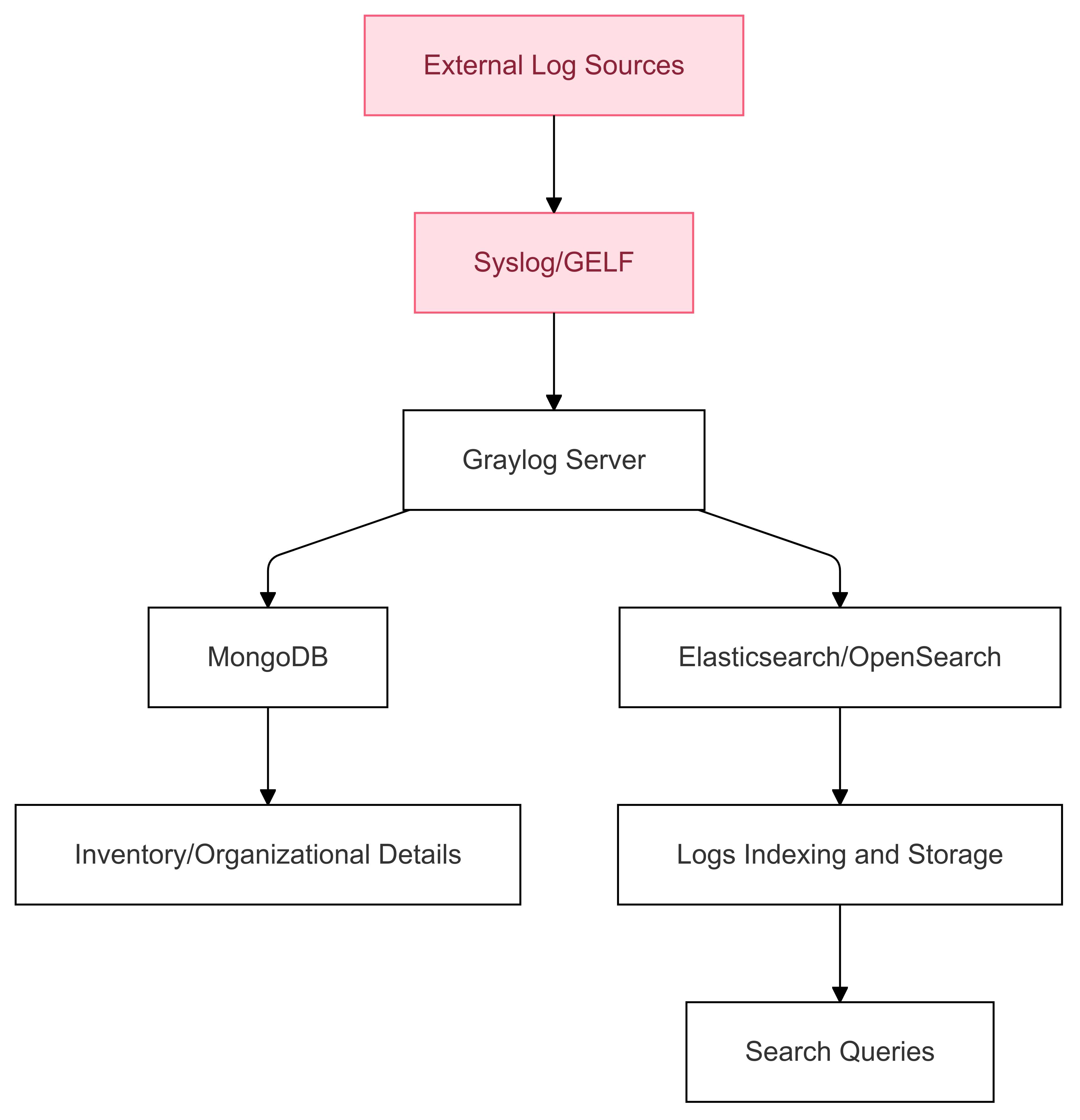 - Syslog/GELF: Represents the external log sources that feed data into Graylog for processing and analysis.