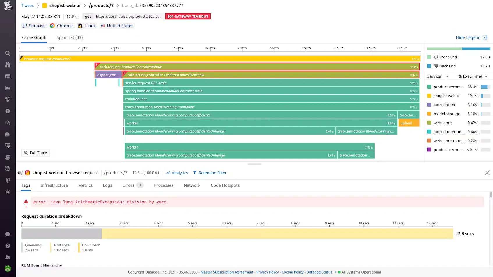 Datadog is a leading observability platform that provides comprehensive monitoring and analytics solutions for modern cloud-scale applications. It allows you to pinpoint issues by seamlessly correlating traces with a variety of data sources, such as logs, infrastructure metrics, database queries, network calls, and frontend telemetry, all in one unified view.