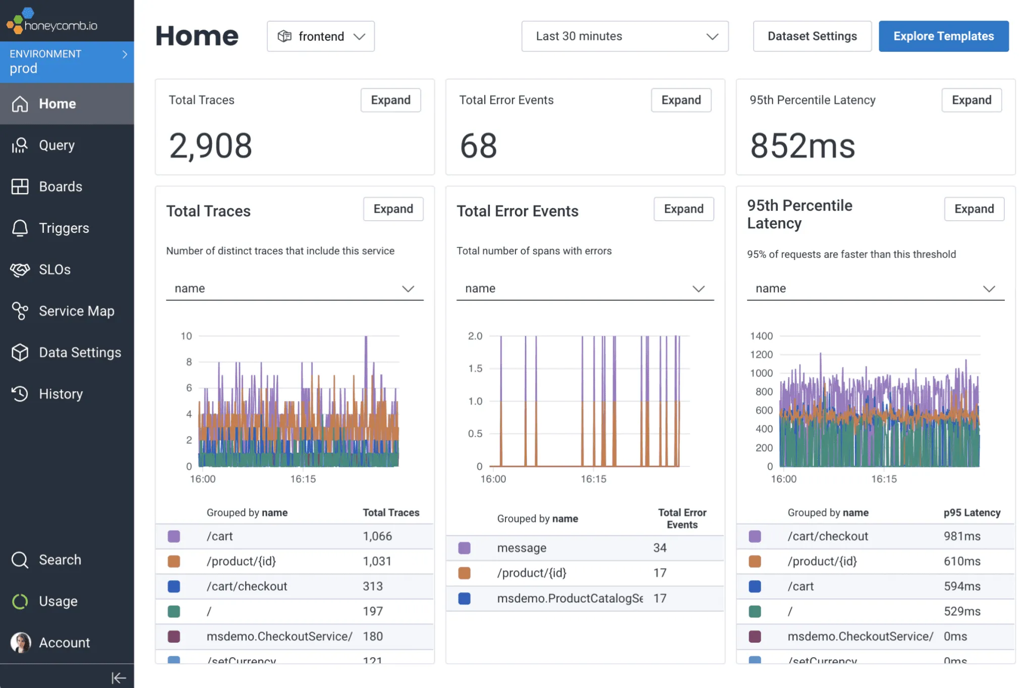 Honeycomb can also identify traces associated with poor user experiences in systems when used with BubbleUp, Honeycomb’s anomaly detection tool, by performing an automatic analysis of attributes across millions of requests.