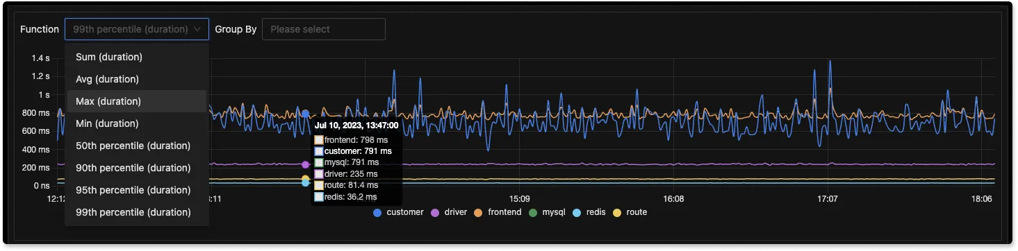 SigNoz also provides advanced features for tracing data. You can run aggregates on trace data and filter it across your application-specific attributes to troubleshoot performance issues.