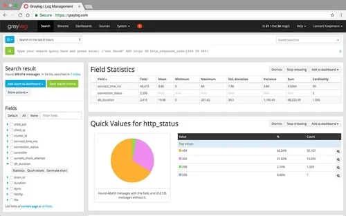 Graylog is an enterprise-level SIEM tool that can help you search and visualize terabytes of data, get notified with alerts, and create or automate reports. In fact, it has a wide variety of widgets like statistical values, stacked charts, quick value results, or search value counts to help you visualize data from logs.
