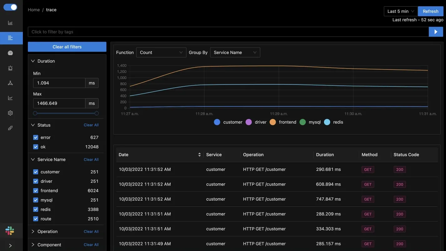SigNoz is a popular full-stack open-source APM tool with powerful features like root cause analysis, live tailing, anomaly detection, detailed trace filtering, and scalable stream processing architecture. Built natively to support OpenTelemetry, SigNoz lets you visualize all three types of signals. Not to mention, it can ingest, process and analyze data at any scale.