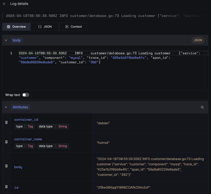 You can view your logs in detailed view with attributes, in json format and context tab that shows logs before and after the selected log from the same source.