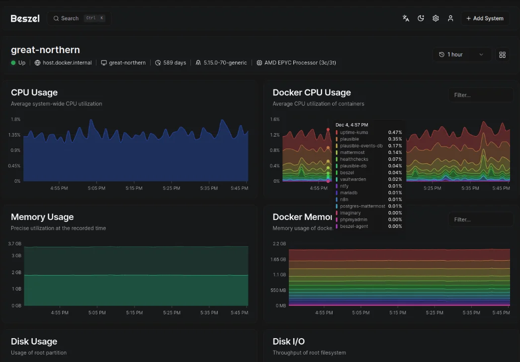 Beszel is a lightweight, self-hosted monitoring tool built with Go, designed for simplicity and minimal resource usage. Teams use it for basic system monitoring in homelabs, small clusters, or resource-constrained environments.