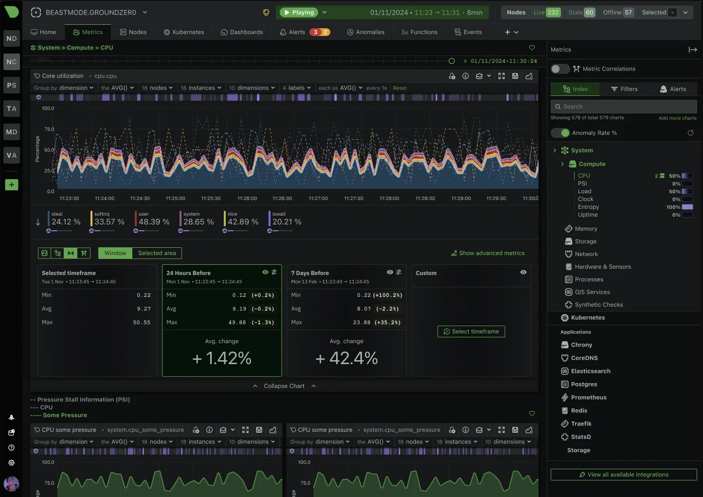 Datadog provides sophisticated anomaly detection with event correlation through Watchdog, escalation workflows, and automated remediation suggestions, designed for complex distributed systems with multiple teams. Netdata, on the other hand, offers AI-powered anomaly detection for infrastructure metrics, with real-time root-cause analysis and conversational AI features, but provides more basic notification routing without native escalation or deep orchestration.
