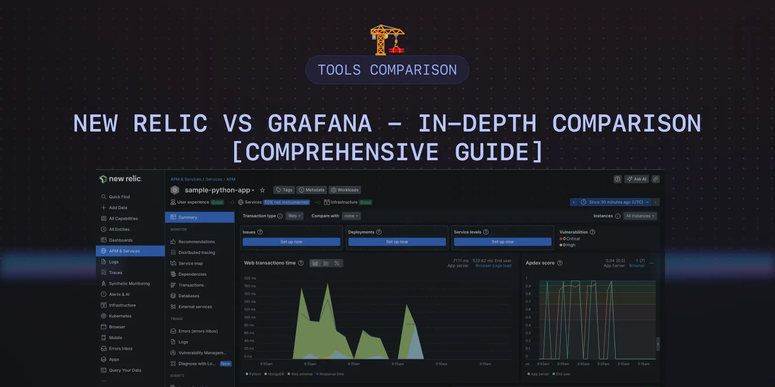 New Relic and Grafana are popular monitoring and observability tools that provide a wide range of products with similar features. In this post, I have compared New Relic and Grafana on important features like APM, log management, infrastructure monitoring, application security, etc.