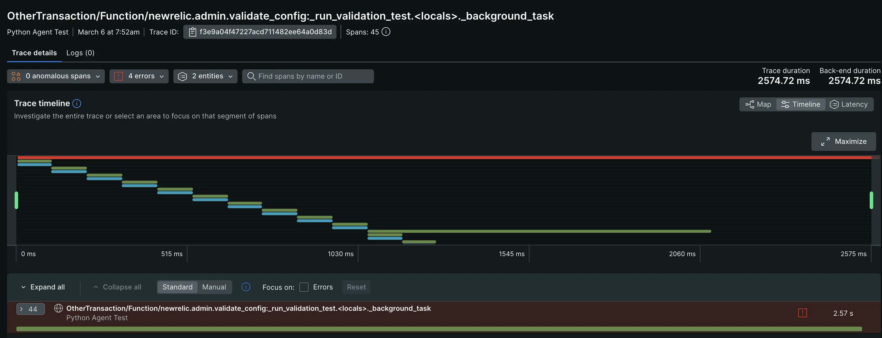 New Relic’s APM feature provided me with real-time monitoring of my application’s telemetry data, including metrics, logs, events, and transactions, through a combination of pre-built and custom dashboards. On the Distributed Tracing page, I was able to filter traces by Trace Groups, Root entry span, Root entity, and Errors. This allowed me to focus more on specific traces with failures and latency issues.