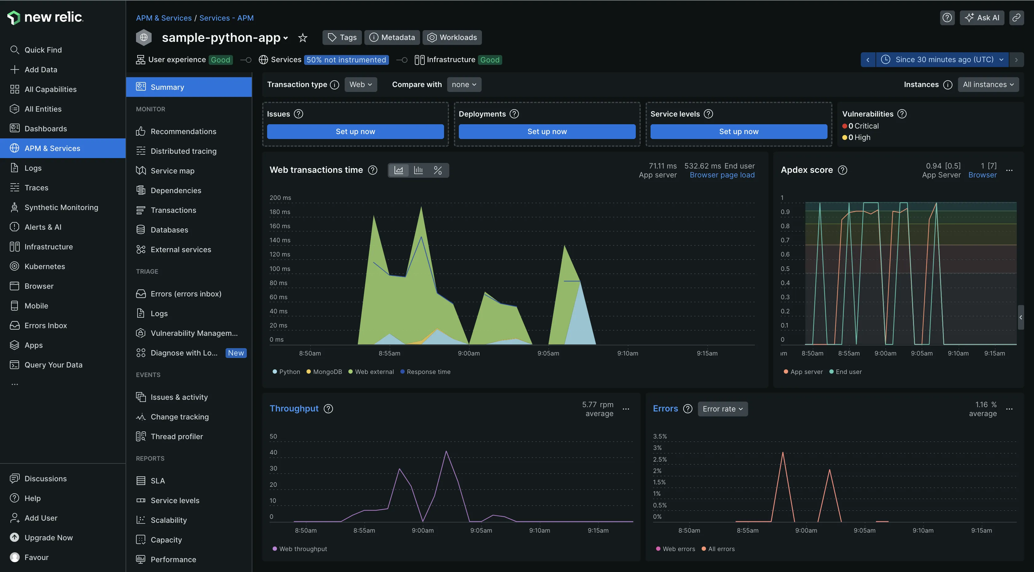 Additionally, it extends its functionality with features like service maps, offering visualization of inter-service relationships and dependencies within an application, SLA reports, vulnerability management, and much more. New Relic’s APM feature is comprehensive, and I was particularly impressed by the depth of information it provided about my application.