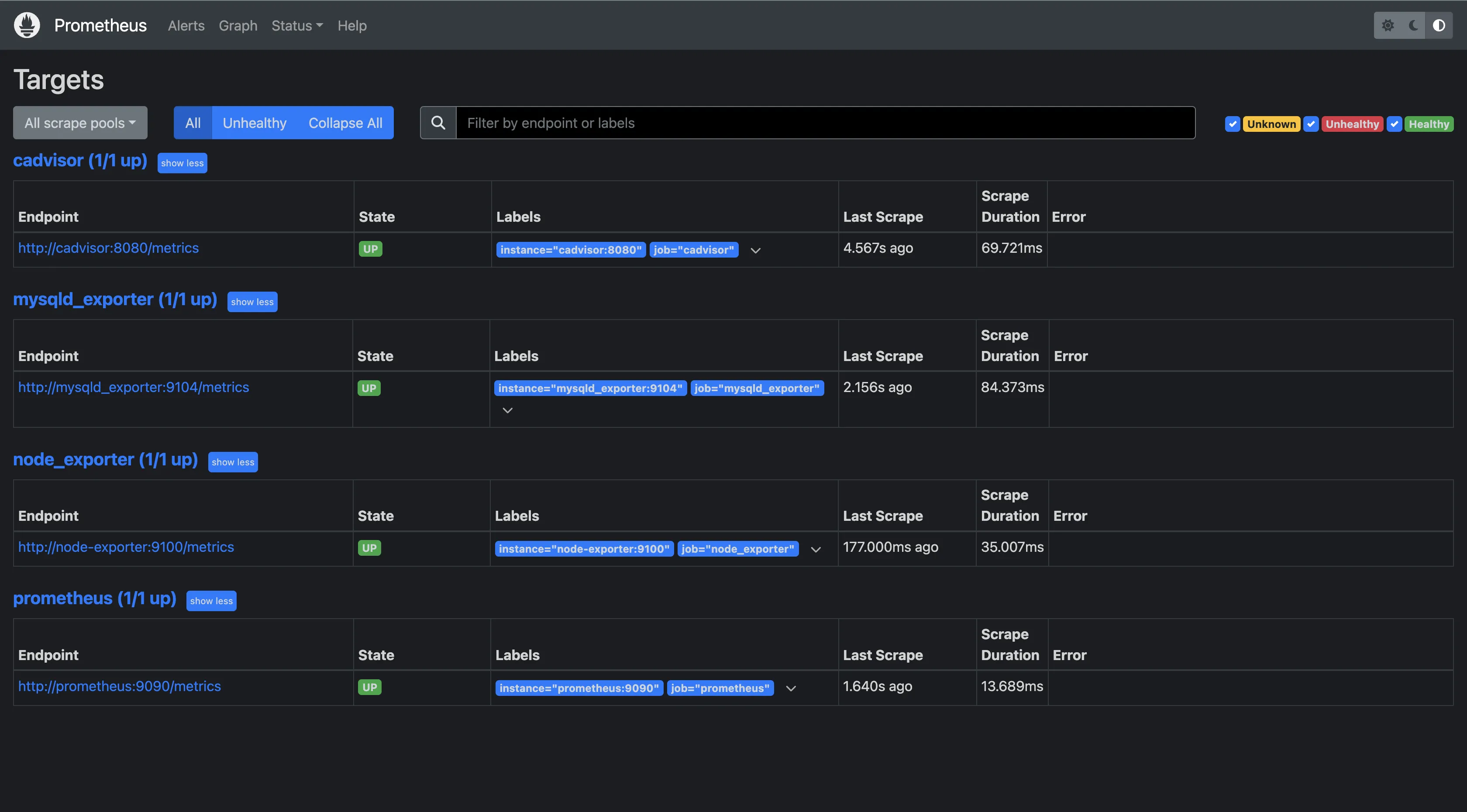 Prometheus also supports data collection from different data sources. It collects data through a pull-based model, where it actively scrapes metrics from configured targets at regular intervals. These targets can be servers, applications, or services that expose metrics in a format that Prometheus can understand, typically over HTTP. It uses a configuration file to define the targets it should scrape, including the URL, the scrape interval, and any specific metrics to collect. From the below image, you can see I was able to scrape metrics from several target endpoints.
