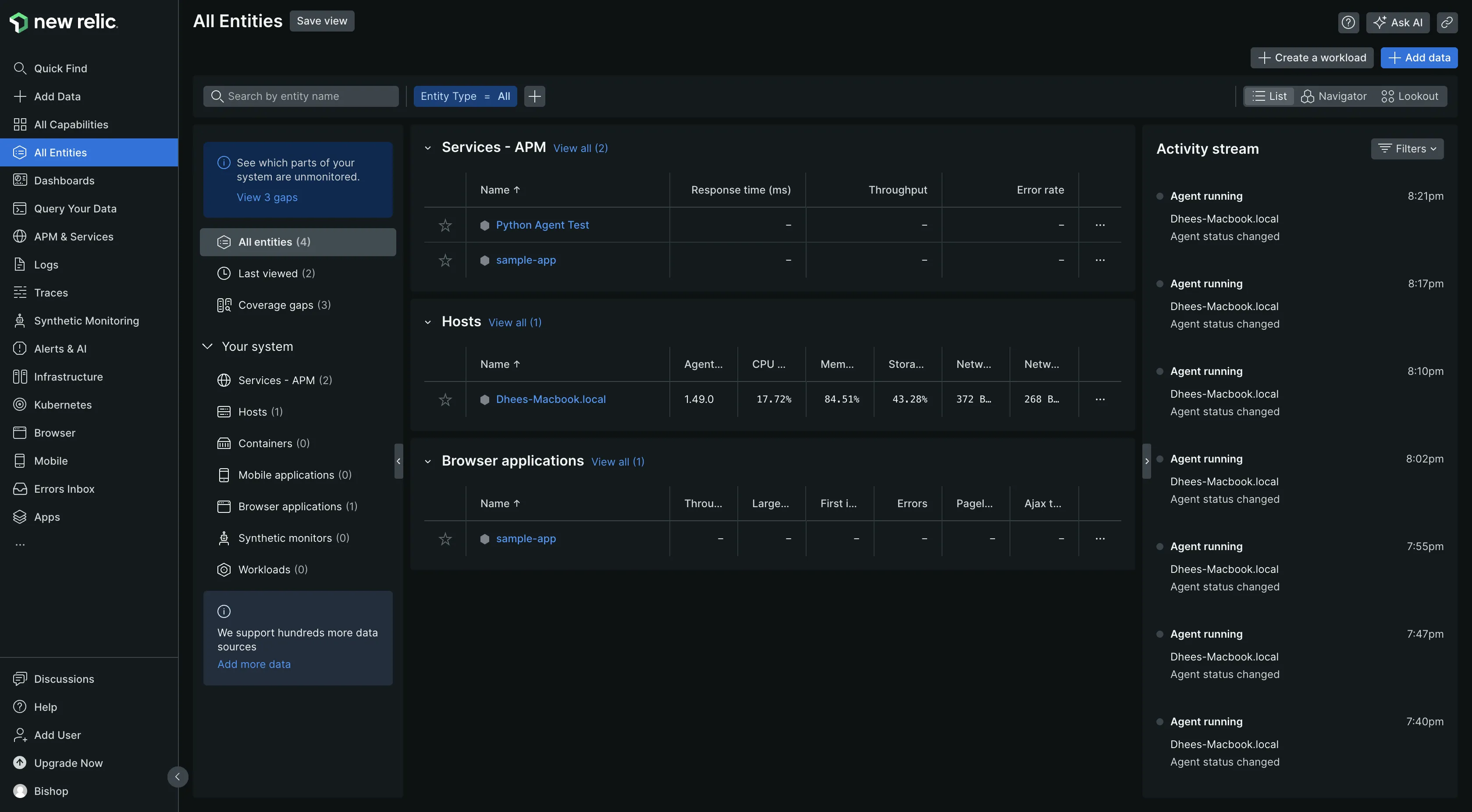 New Relic provides a total of 1083 data sources for data collection without the need for any configuration. Collecting data from my sample Python application was very easy. All I had to do was install the New Relic agent on my system and start the application with the agent.