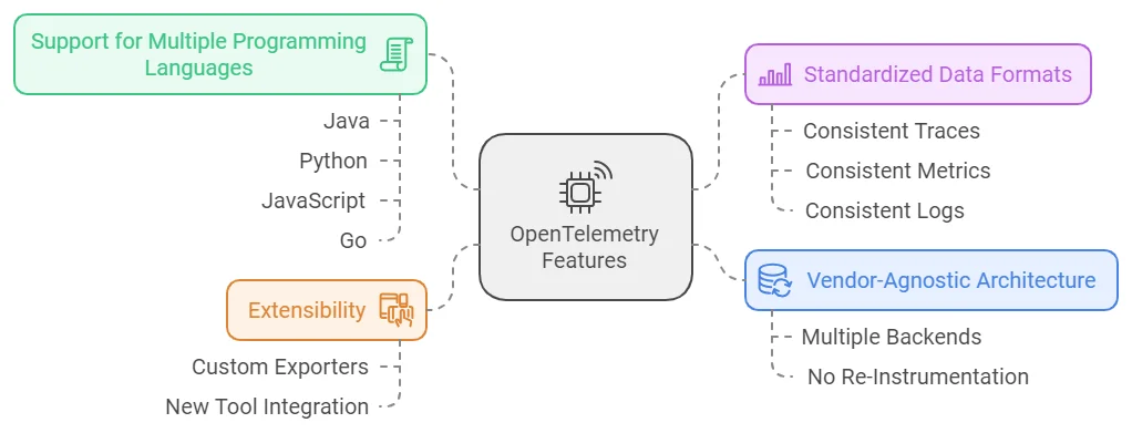 - Standardized Data Formats: OpenTelemetry enforces standardized formats for telemetry data, ensuring that traces, metrics, and logs are collected consistently. This makes it easier to integrate with various backends and visualization tools.