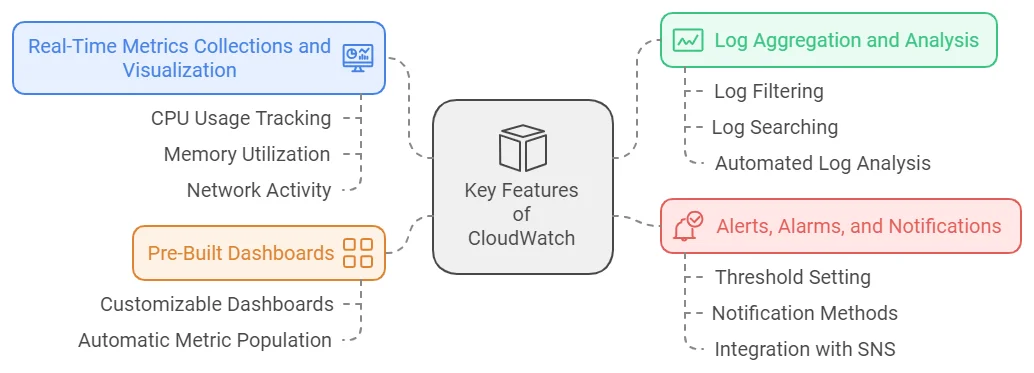 - Real-Time Metrics Collections and Visualization: CloudWatch automatically collects and monitors performance data from AWS services, making it easy to track key performance indicators like CPU usage, memory utilization, and network activity.