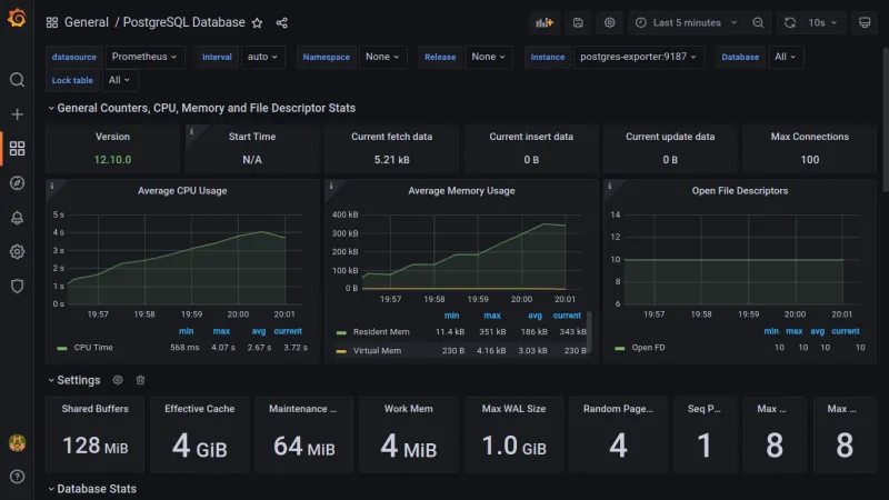 - It offers pre-built PostgreSQL dashboards that display both host-specific metrics and container metrics.