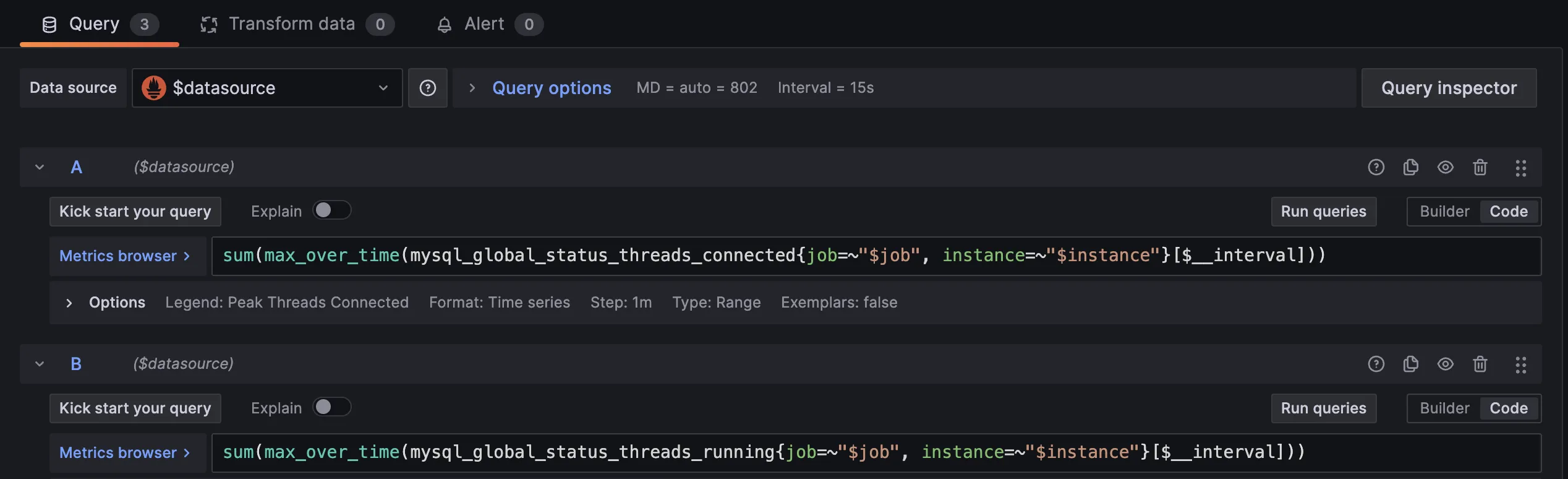 Grafana's data query functionality is specific to the data source in use. For instance, if you have configured Prometheus with a MySQLD exporter to collect metrics from a MySQL database and you subsequently select Prometheus as the data source within Grafana, your data queries will be executed using PromQL. You can see an example, as shown in the image below.