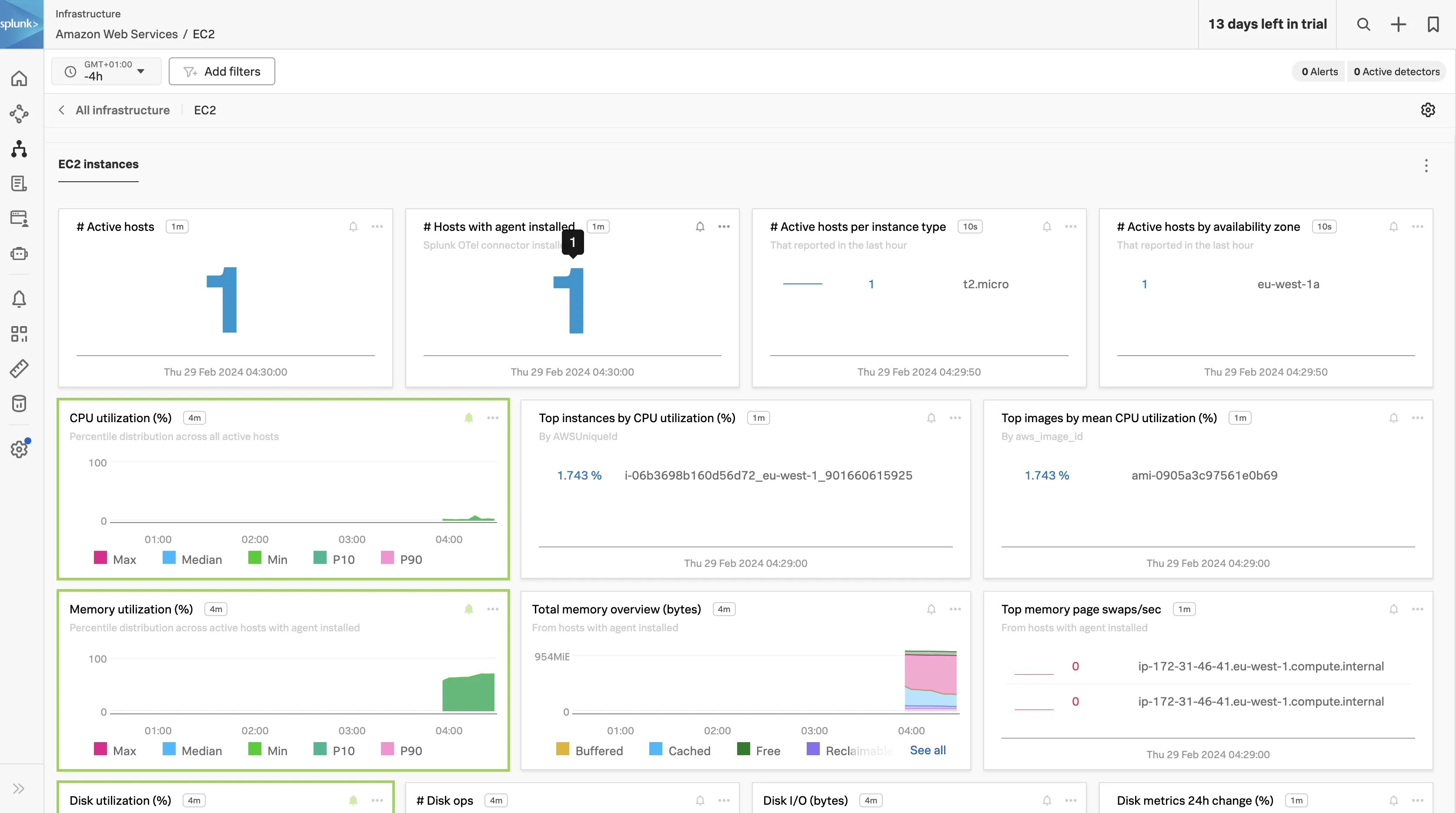 The metrics are then monitored in real-time using different visualizations. Dashboards can be utilized for this as the Splunk Observability Cloud platform comes with out-of-the-box dashboards. Custom dashboards can also be created to monitor custom or other specific metrics and alerts can be set up on the metrics.
