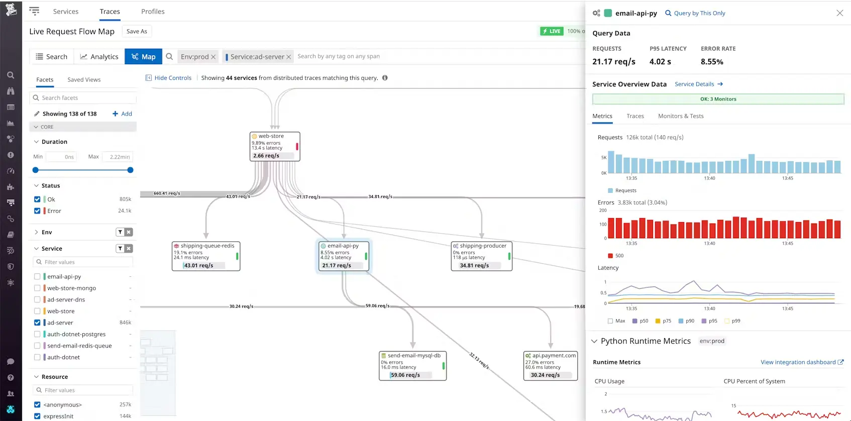 In Datadog, an investigation is often a structured, UI-driven workflow. You might start with a dashboard showing a spike in errors, click on a failing service to view its traces, and then pivot to the logs associated with those specific traces. Because data is parsed and tagged upfront in pipelines, filtering is fast and intuitive. This guided experience is excellent for quickly narrowing down known issues.