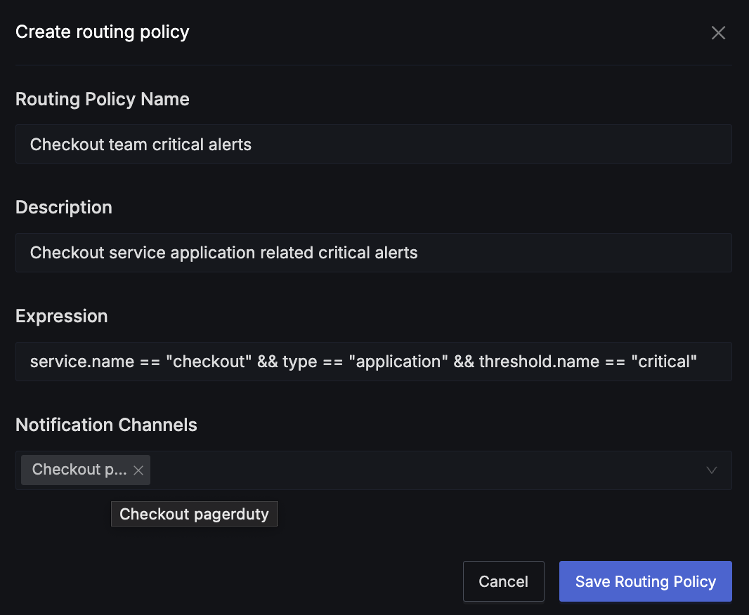 - Routing Policy Name: A descriptive name for your policy (e.g., "Checkout team critical alerts")