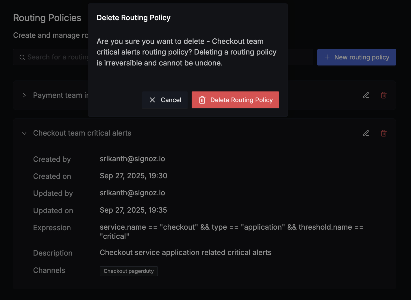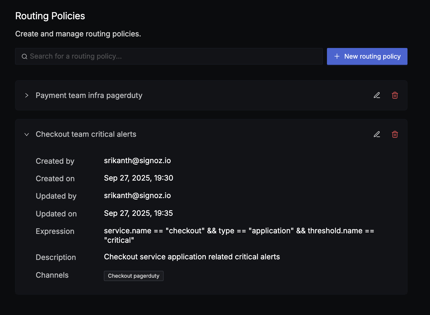 When an alert fires, SigNoz evaluates it against all enabled routing policies: