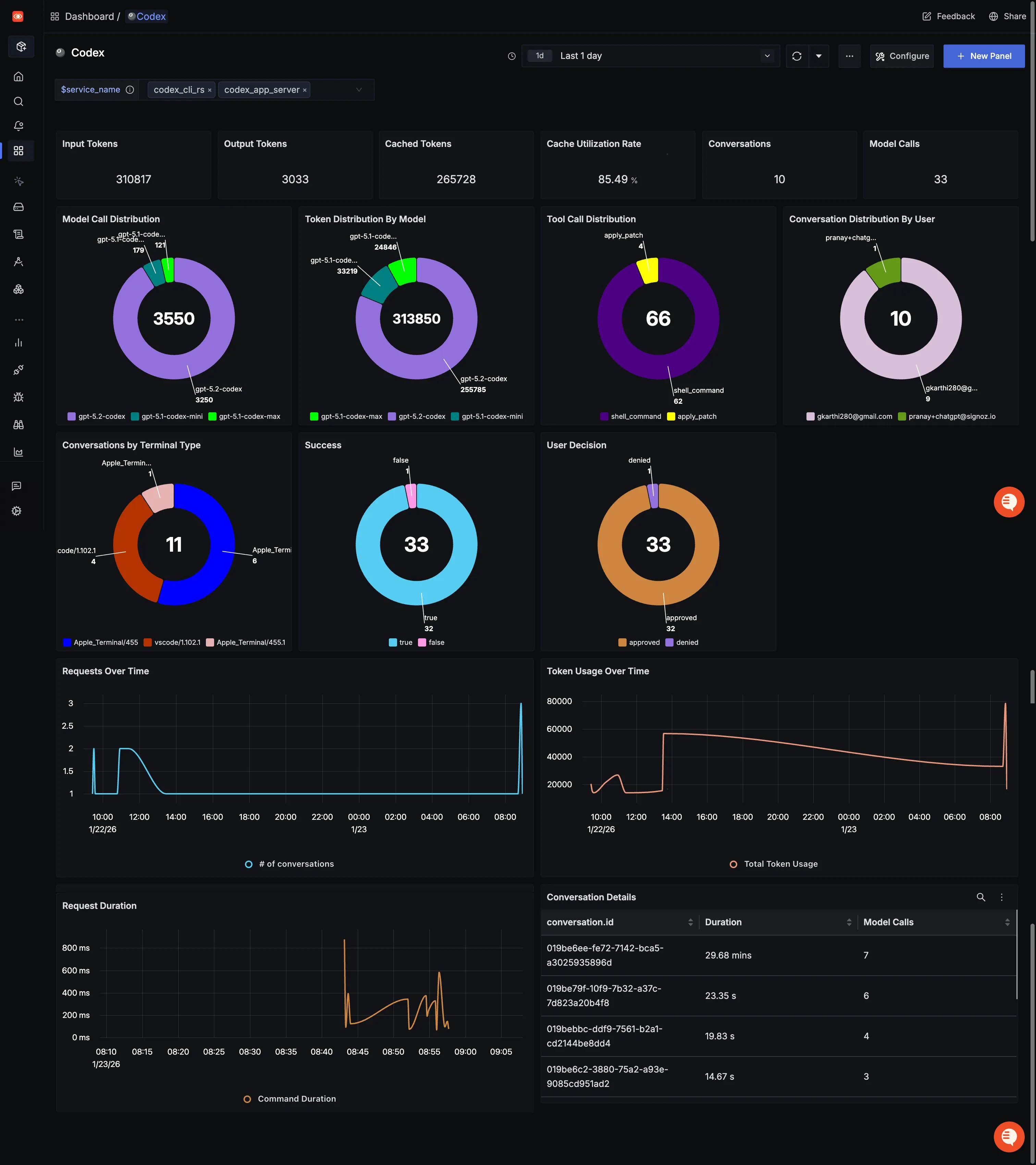 You can also check out our custom Codex dashboard here which provides specialized visualizations for monitoring your Codex usage in applications. The dashboard includes pre-built charts specifically tailored for LLM usage, along with import instructions to get started quickly.