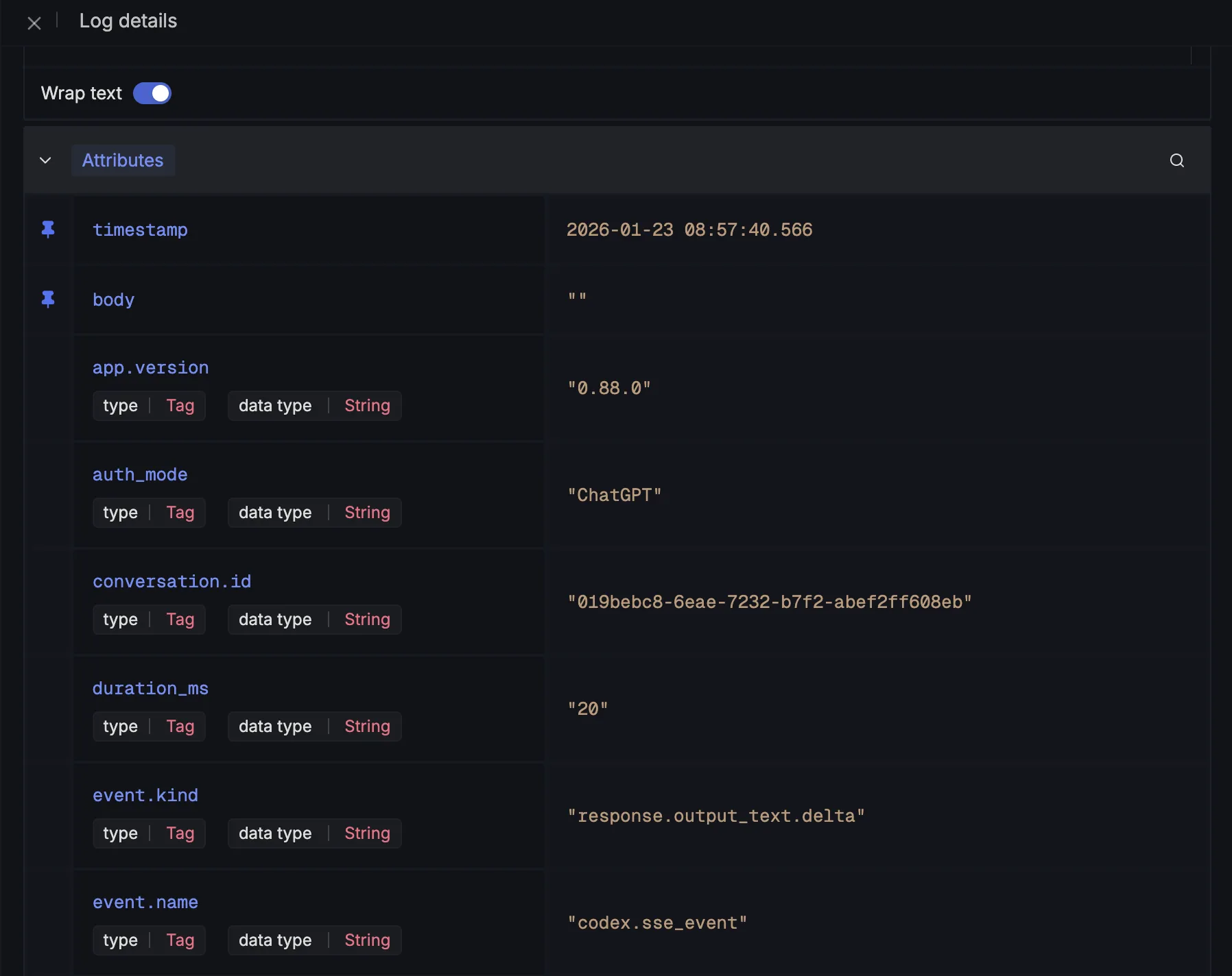 When you click on any of these logs in SigNoz, you'll see a detailed view of the log, including attributes: