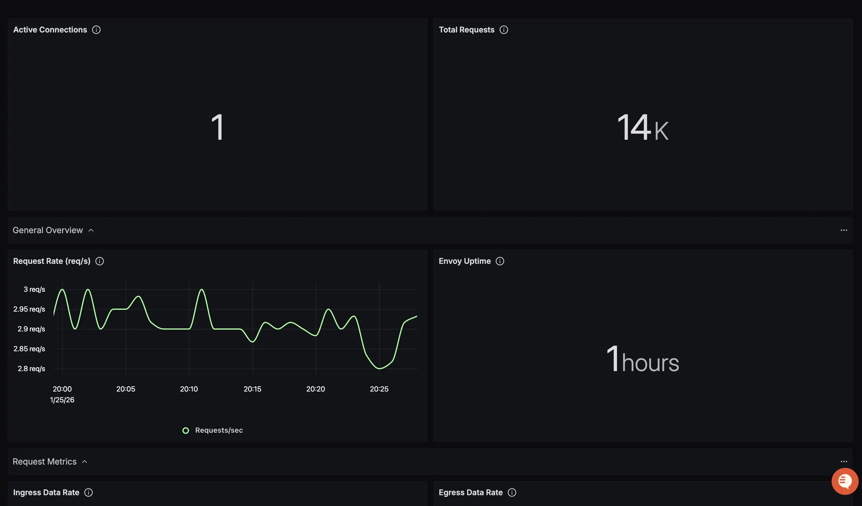 This dashboard provides comprehensive monitoring of Envoy Proxy performance, giving you visibility into: