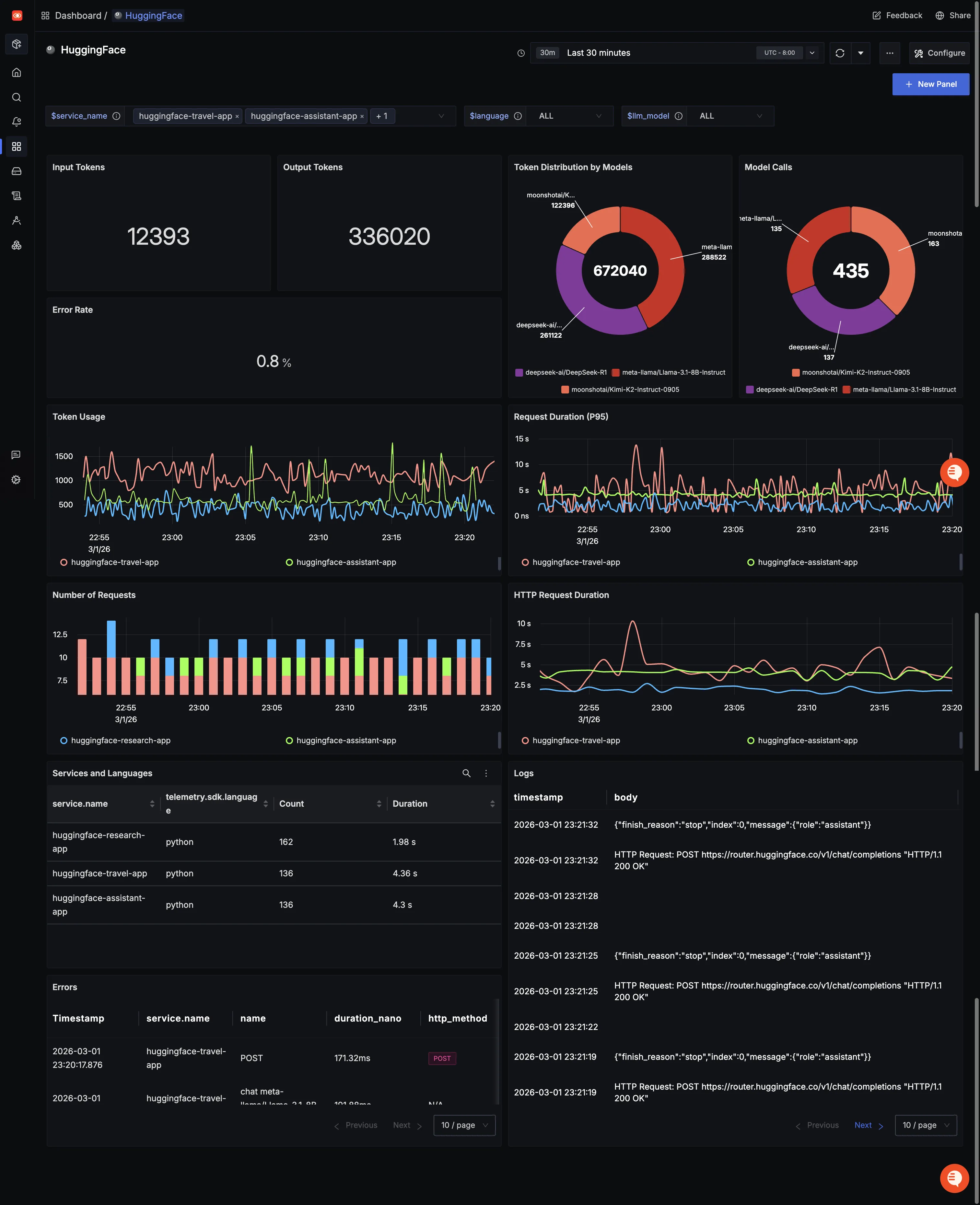 This dashboard tracks critical performance metrics for your Hugging Face usage using OpenTelemetry to help you: