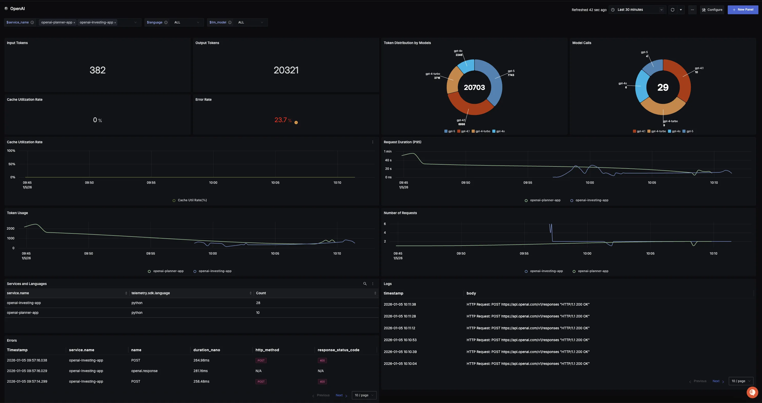 This dashboard offers a clear view into OpenAI usage and performance. It highlights key metrics such as model distribution, error rates, request volumes, and latency trends. Teams can also track detailed records of errors, to better understand adoption patterns and optimize reliability and efficiency.