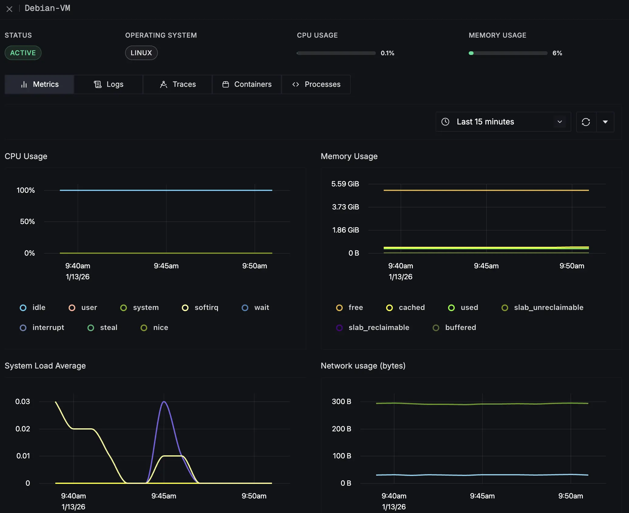 The OpenTelemetry hostmetrics receiver collects metrics on CPU, memory, disk, network, paging, and system performance.