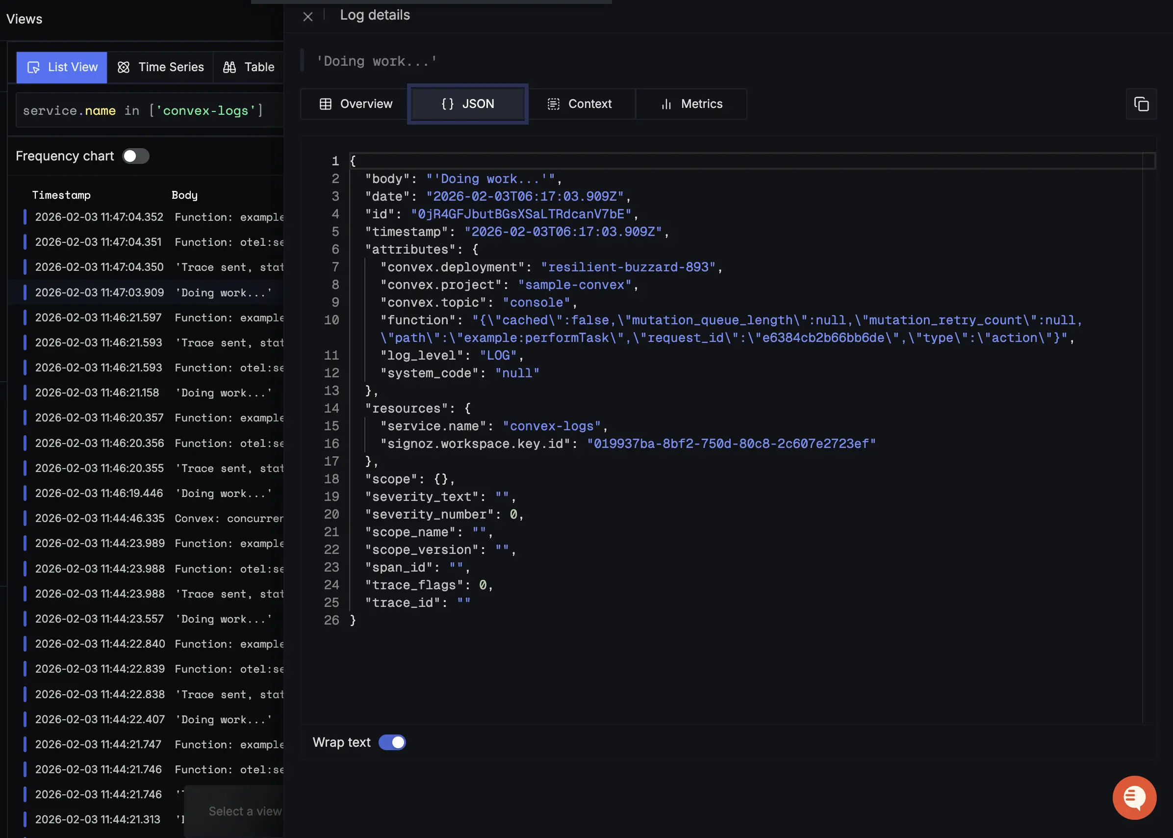 <region>: Your SigNoz Cloud region<your-ingestion-key>: Your SigNoz ingestion key<your-convex-secret>: The HMAC secret from your Convex dashboard<service-name>: (Optional) Service name for logs in SigNoz, defaults toconvex-logs<port>: (Optional) Server port, defaults to3080
