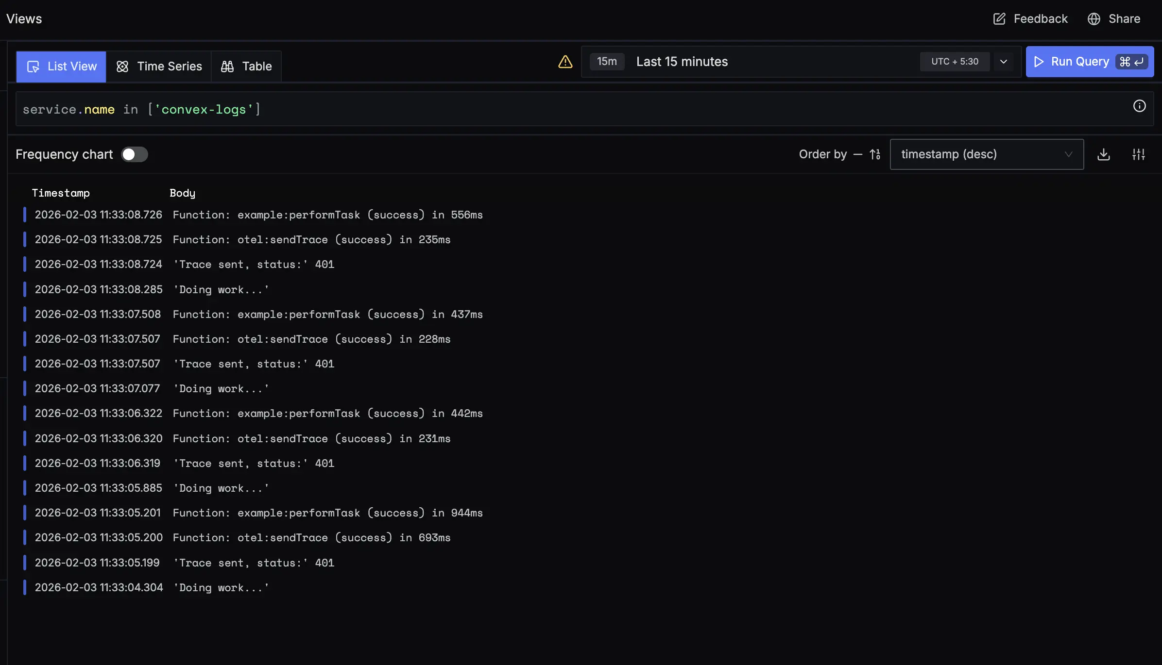 console.log("Hello from Convex")) - Open SigNoz → Logs Explorer