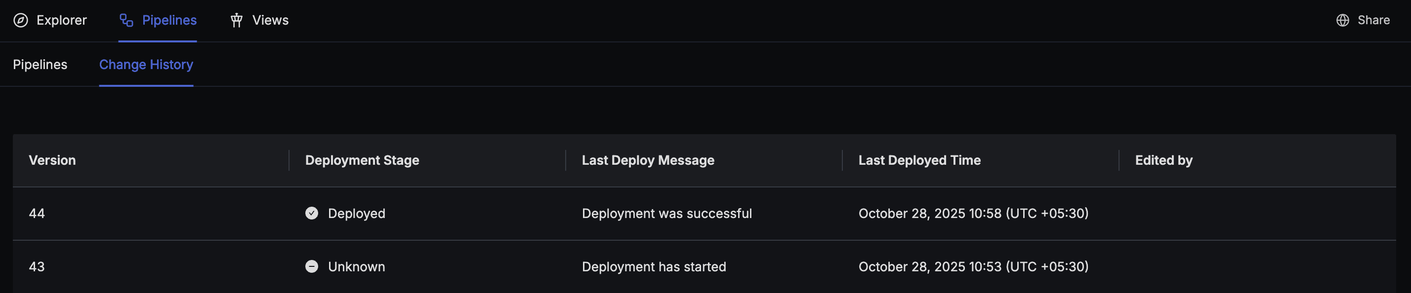 You can track the deployment status of your pipelines using the Change History tab at the top of pipelines.