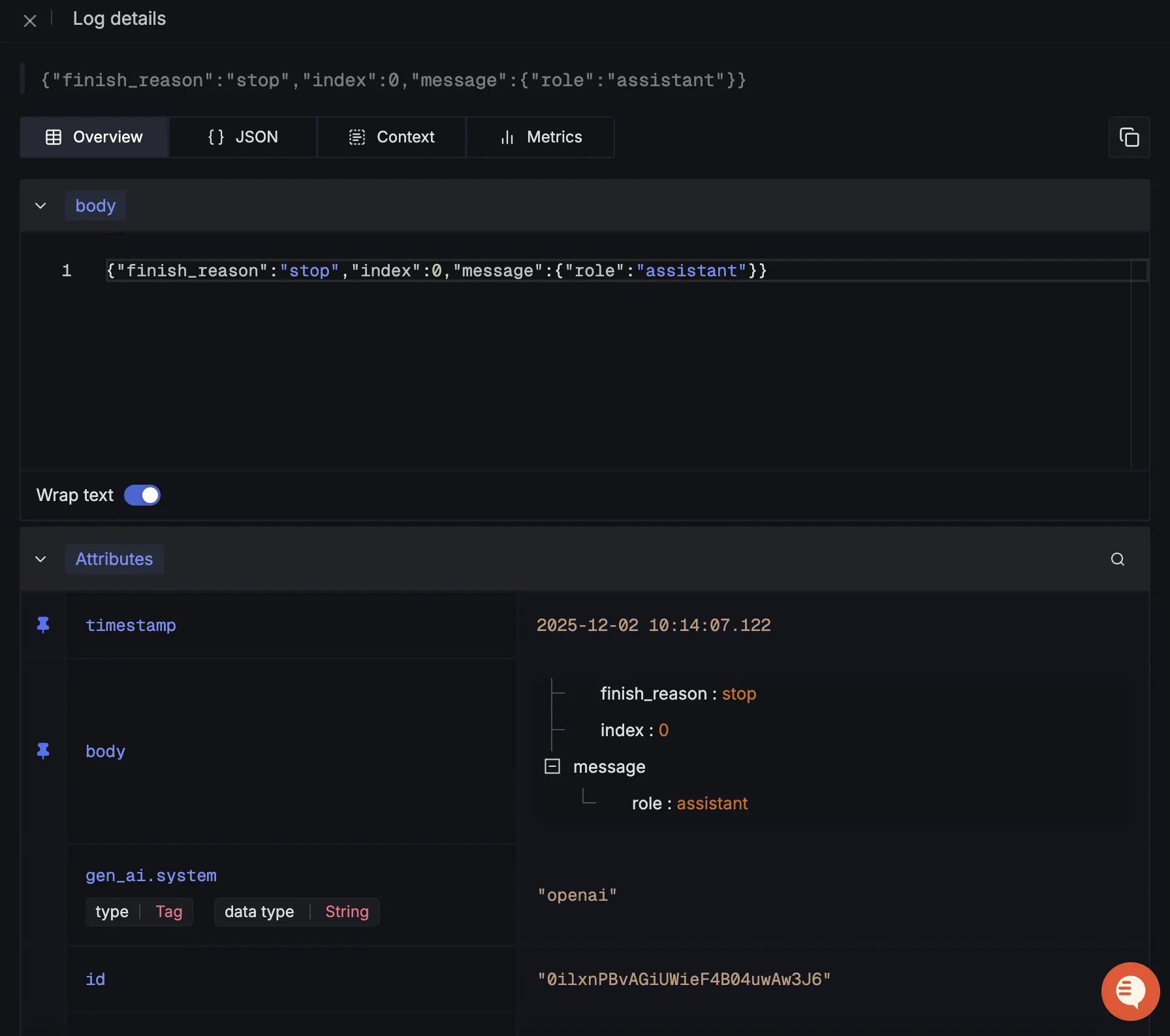 When you click on any of these logs in SigNoz, you'll see a detailed view of the log, including attributes: