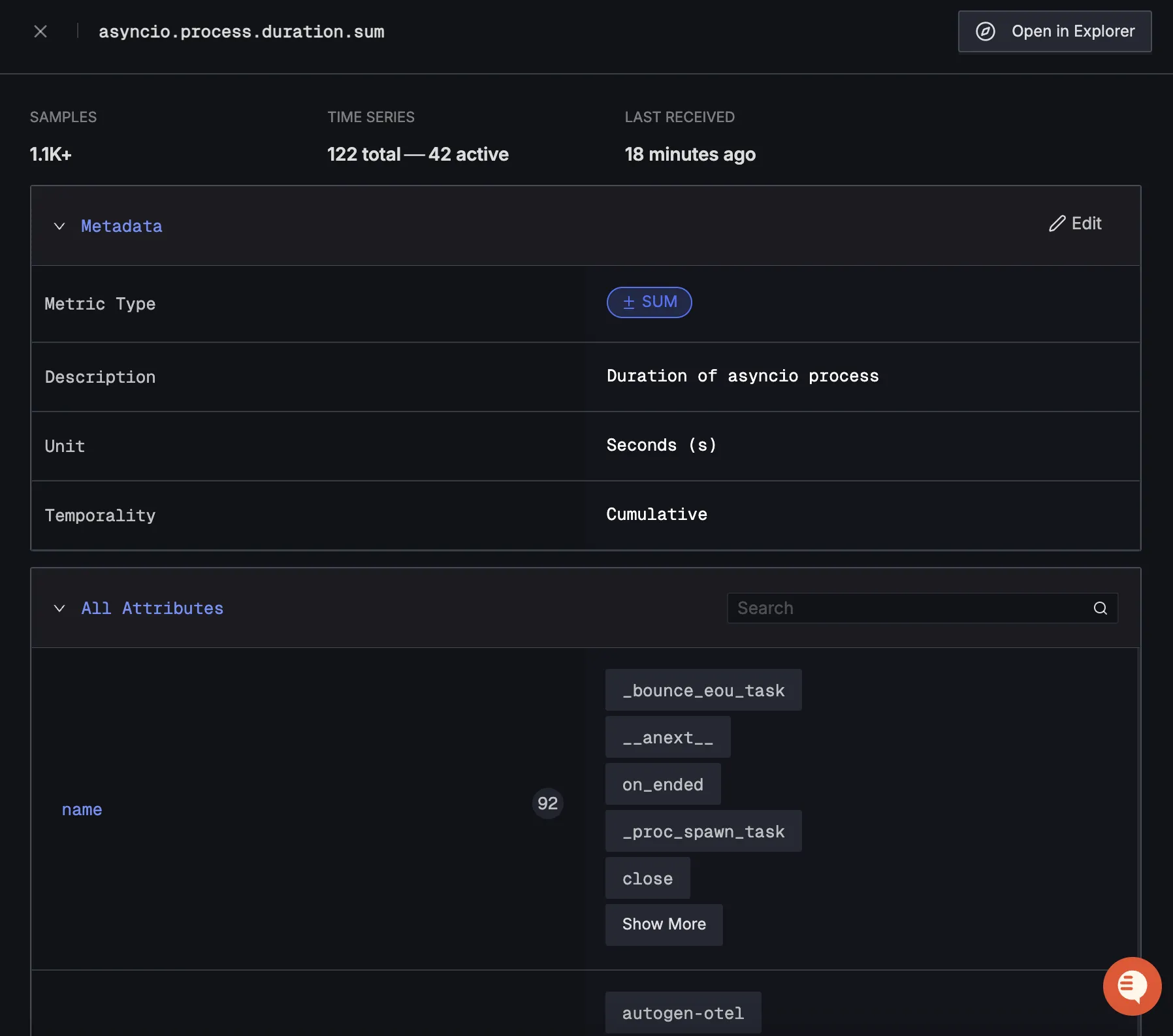 When you click on any of these metrics in SigNoz, you'll see a detailed view of the metric, including attributes: