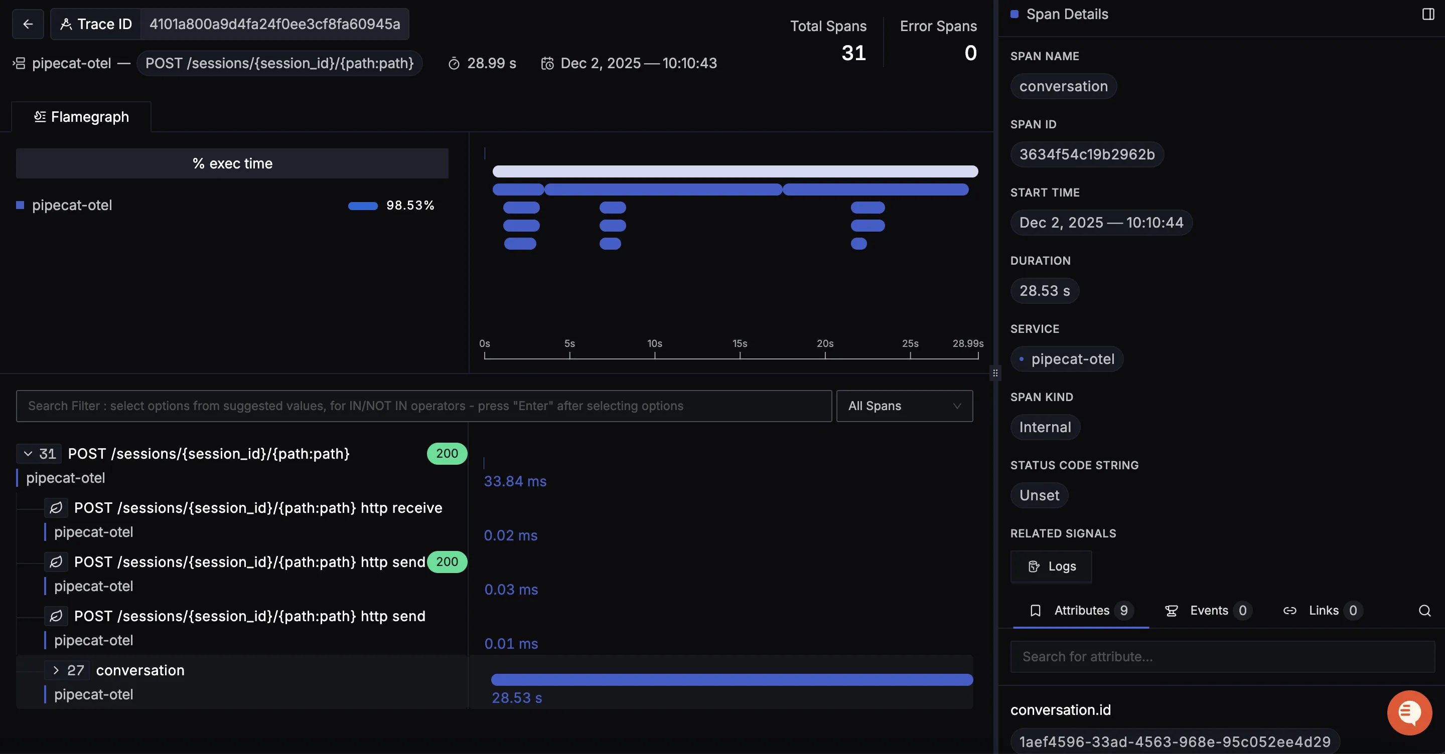 This guide walks you through setting up monitoring and observability for Pipecat using OpenTelemetry and exporting logs, traces, and metrics to SigNoz. With this integration, you can observe the performance of various models, capture request/response details, and track system-level metrics in SigNoz, giving you real-time visibility into latency, error rates, and usage trends for your Pipecat applications.