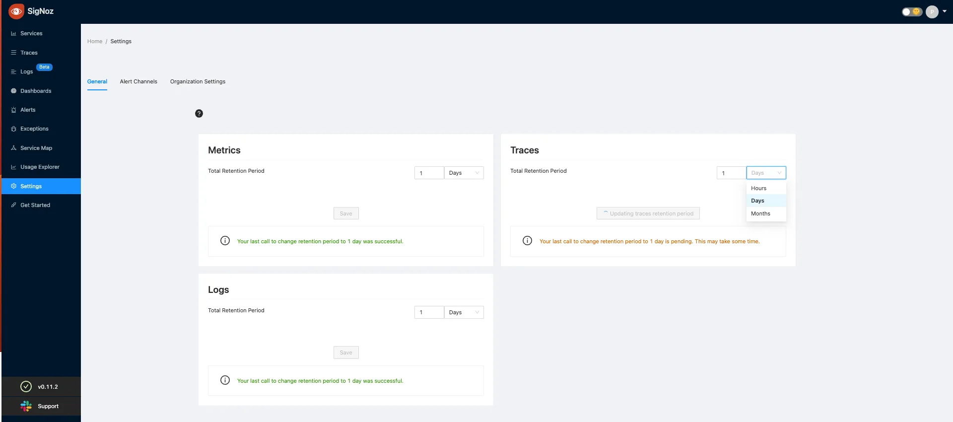 By default, retention period is set to 15 days for logs and traces, and 30 days for metrics. To set retention period for metrics, traces and logs, you can navigate to the General tab on the Settings page.